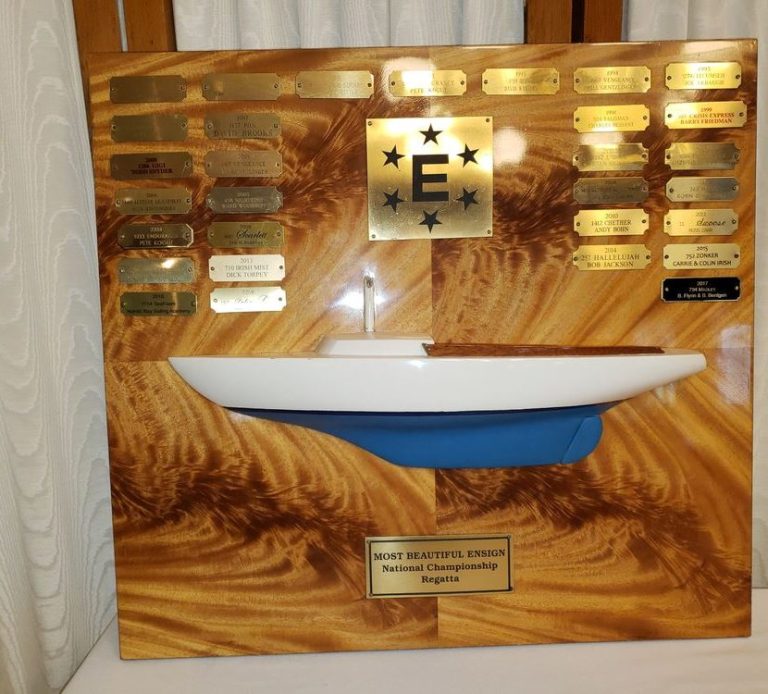 The Most Beautiful Ensign Trophy, to recognize pride and enthusiasm in the upkeep of one's Ensign, shall be awarded at the National Championship Regatta. Any Ensign owner may compete for this trophy, the winner of which will be selected by a panel of judges. The criteria for this award will be based, on but not limited to, rigging, ingenuity, surface finishes, and overall presentation. No boat may win this award two years in succession.